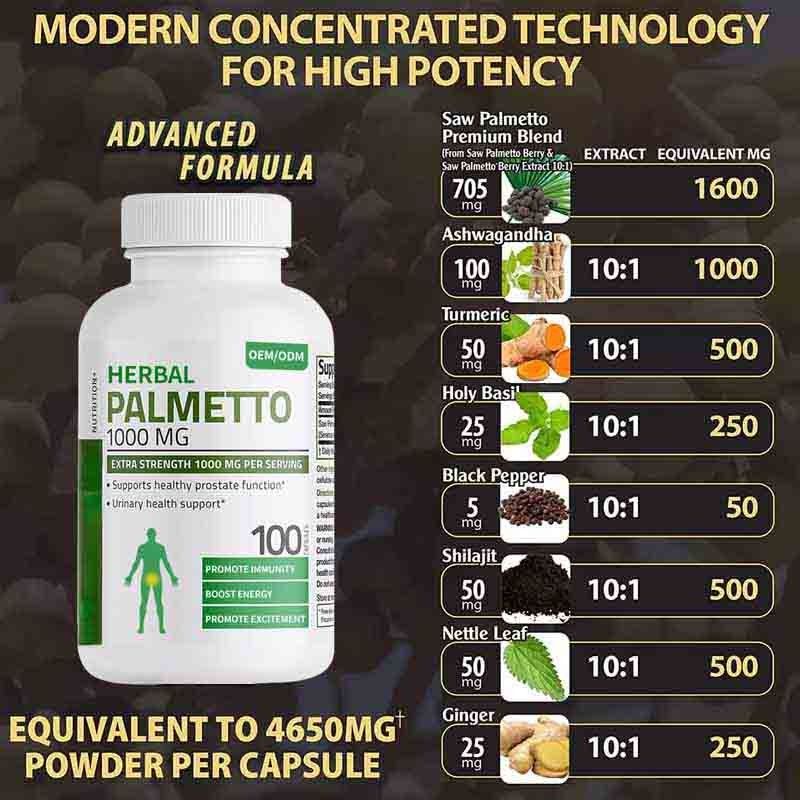 Ürünümüz, doğal bitkinin en güçlü parçası olan palmetto meyvelerinden yapılmıştır.Bitkinin meyveleri genellikle prostat sağlığını iyileştirmek ve hormon seviyelerini dengelemek ve hem erkeklerde hem de kadınlarda saç dökülmesini önlemek için kullanılırÇıkarmanın yanı sıra, doğal olarak idrar yollarının (UT) sağlığını artırmak için tüm meyve meyvelerini kullanıyoruz.